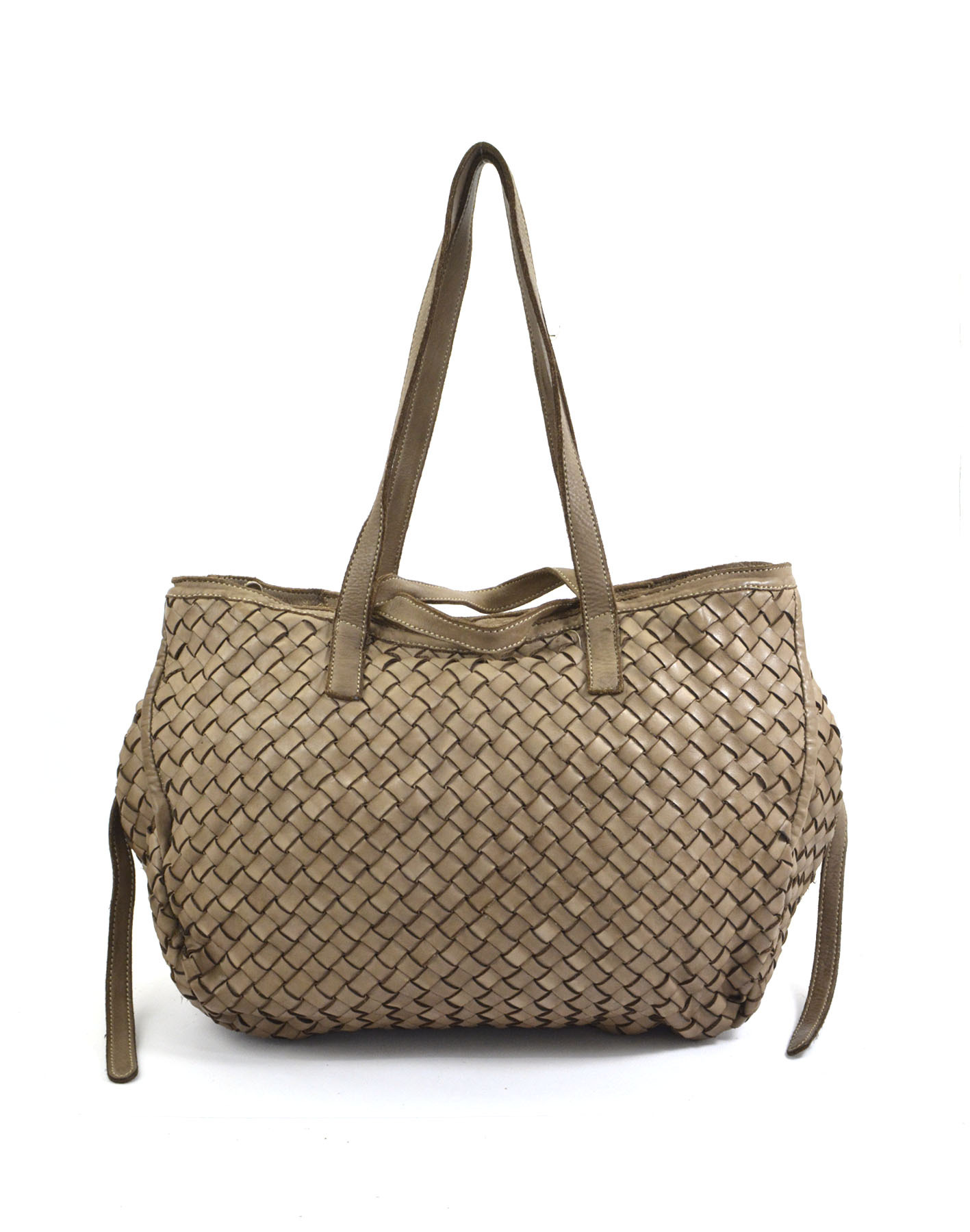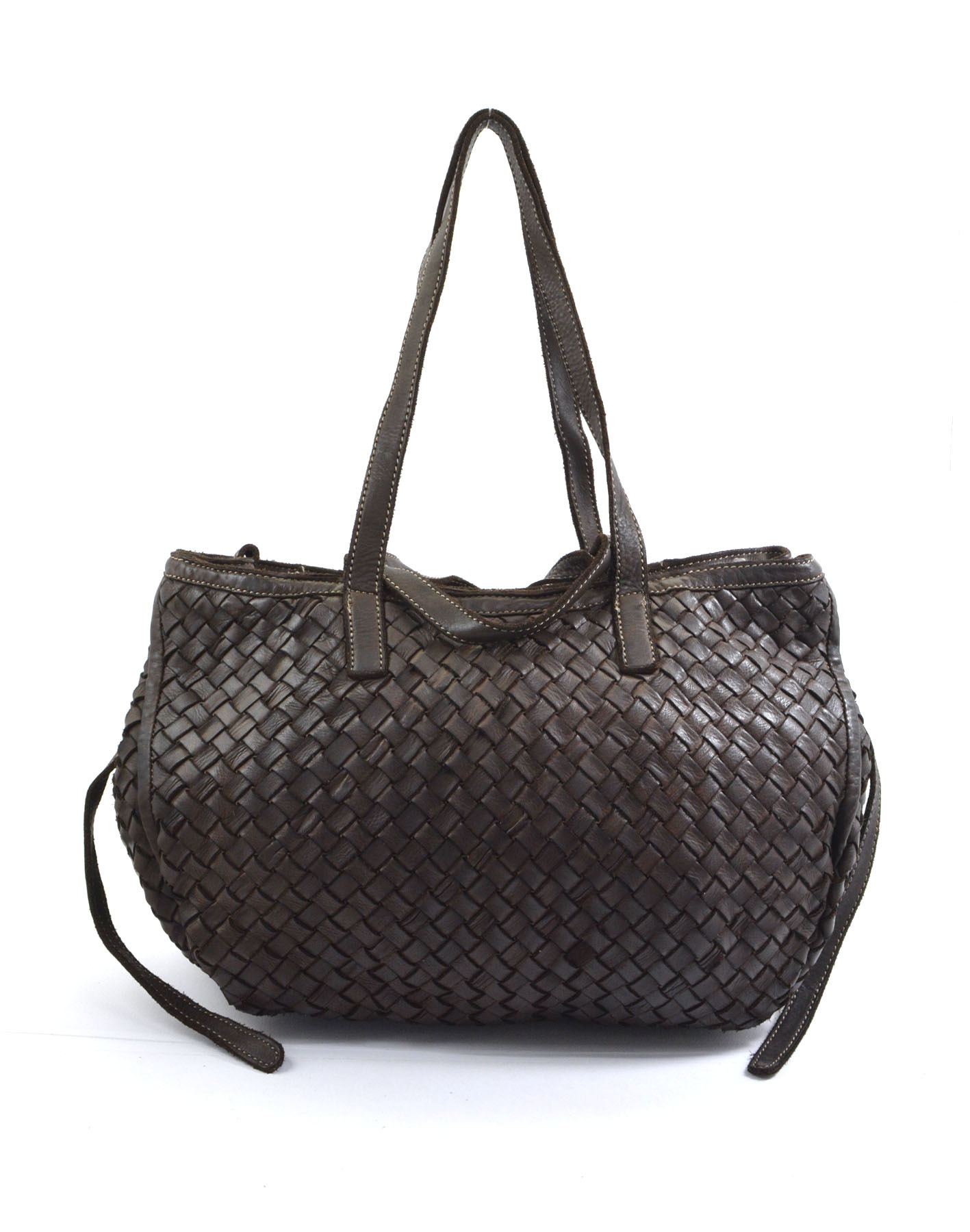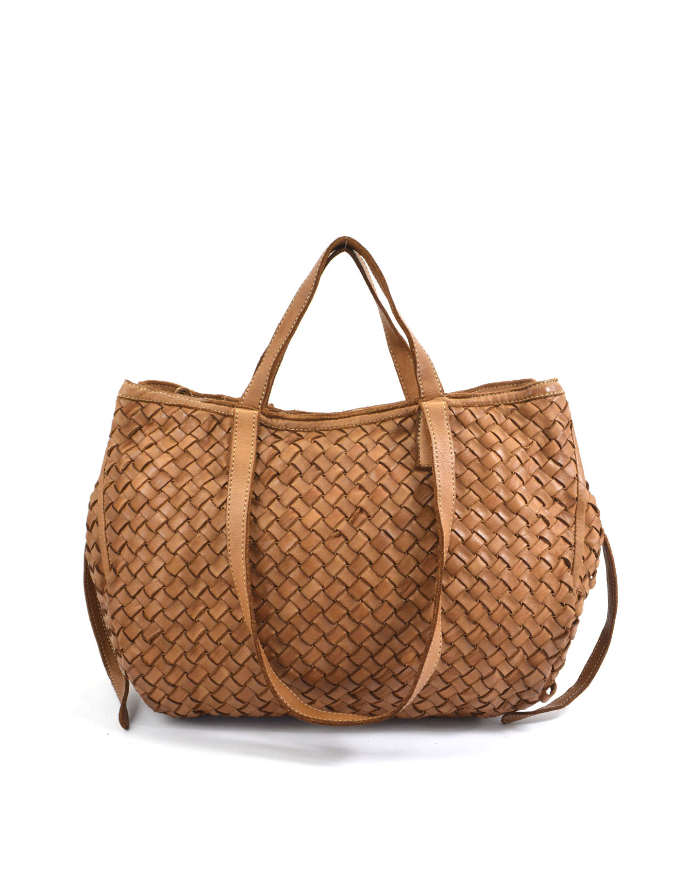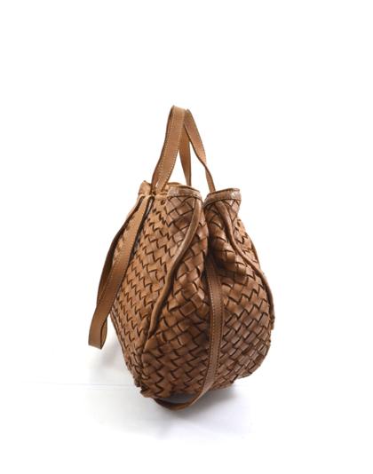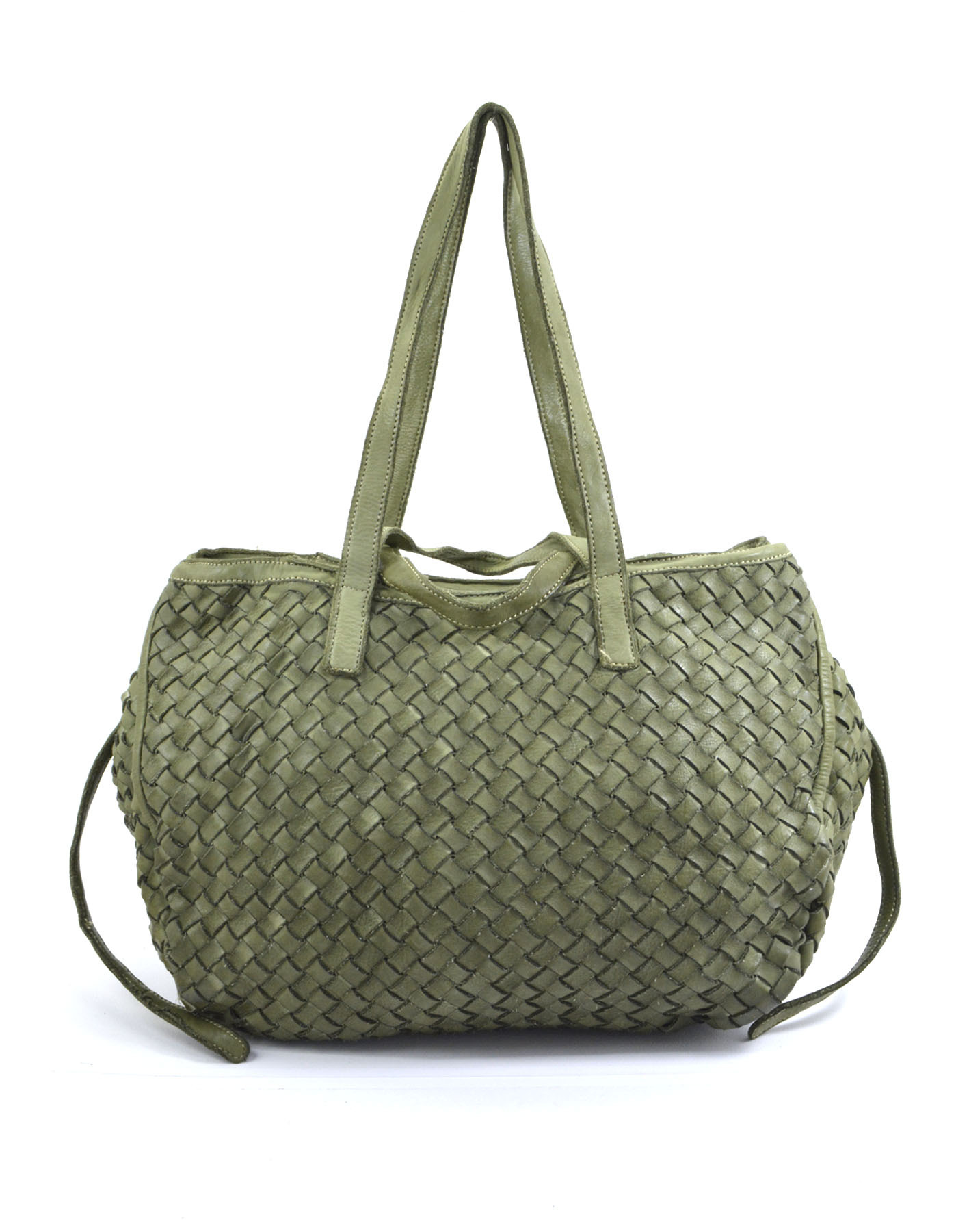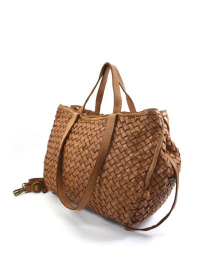 Garment-dyed woven calfskin bag with double handles for shoulder or hand carry. Side buttons adjust the opening size.