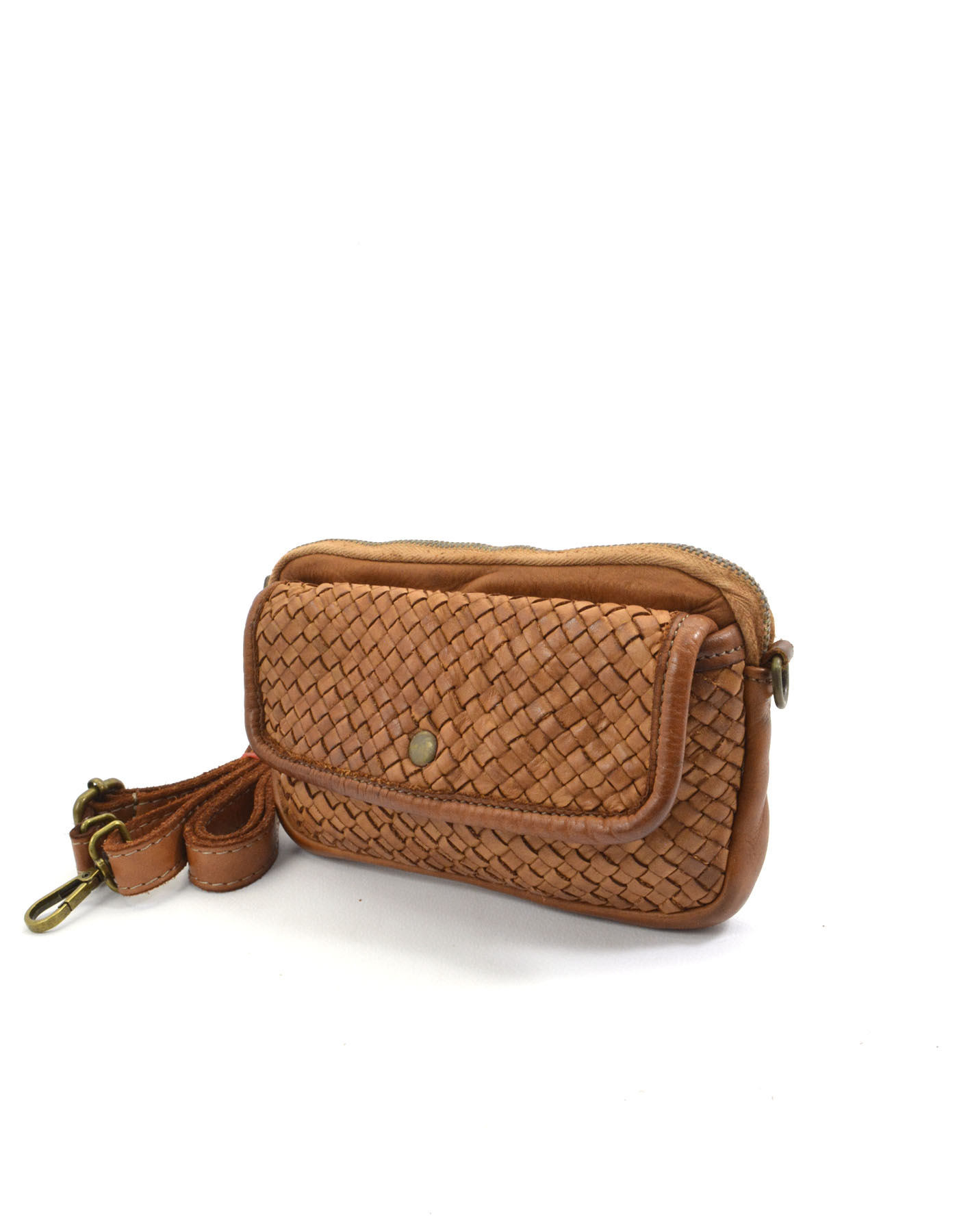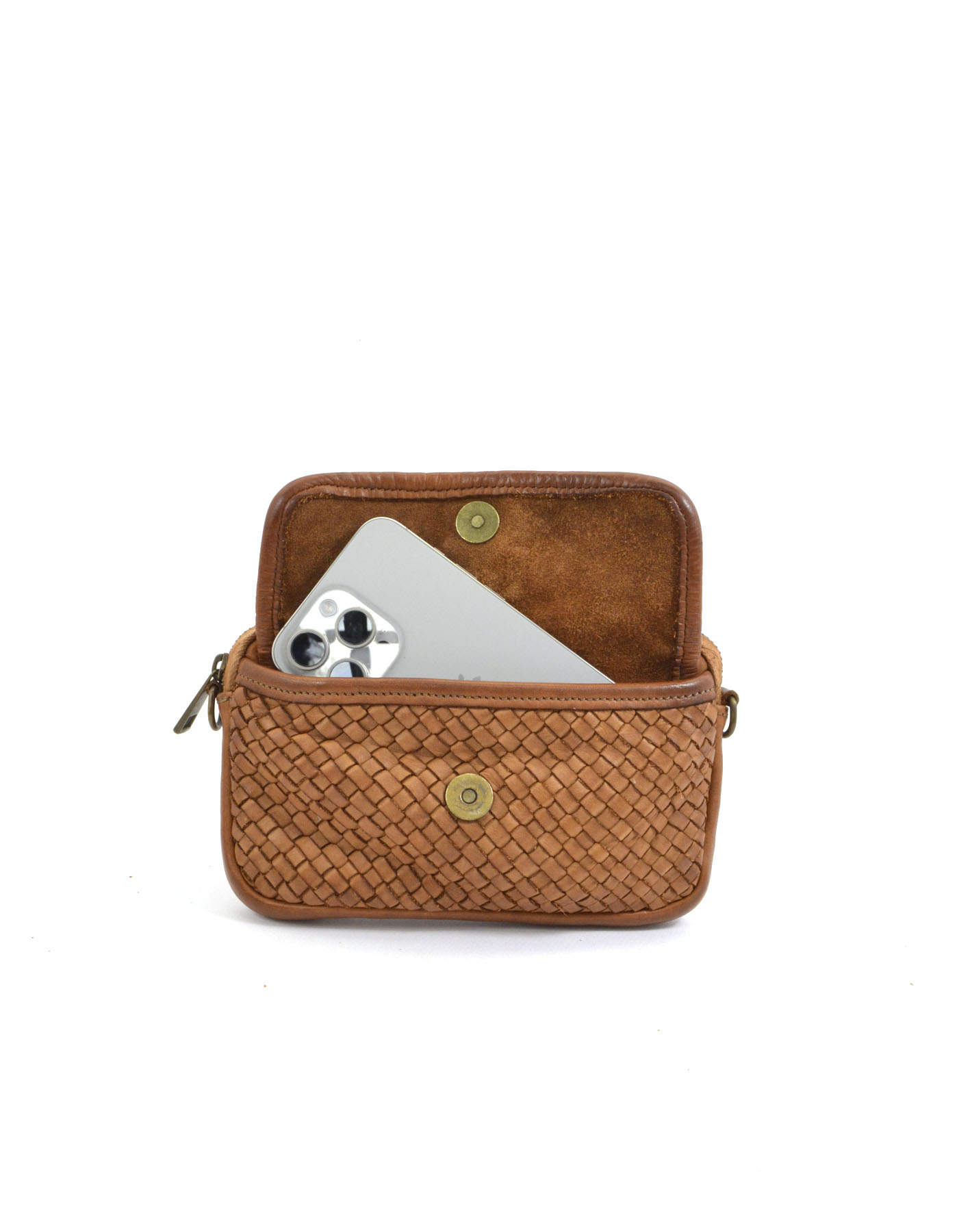 Cell phone bag in woven calfskin, dyed in the garment,