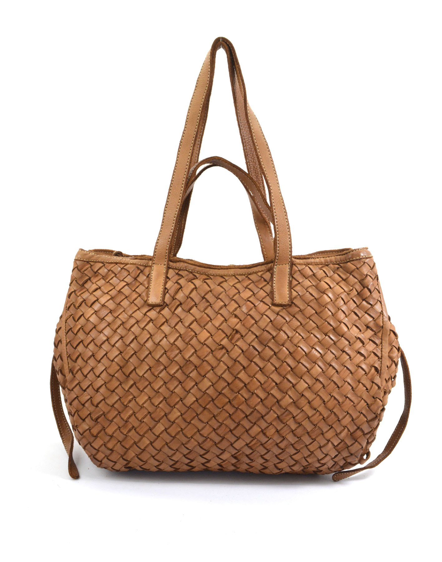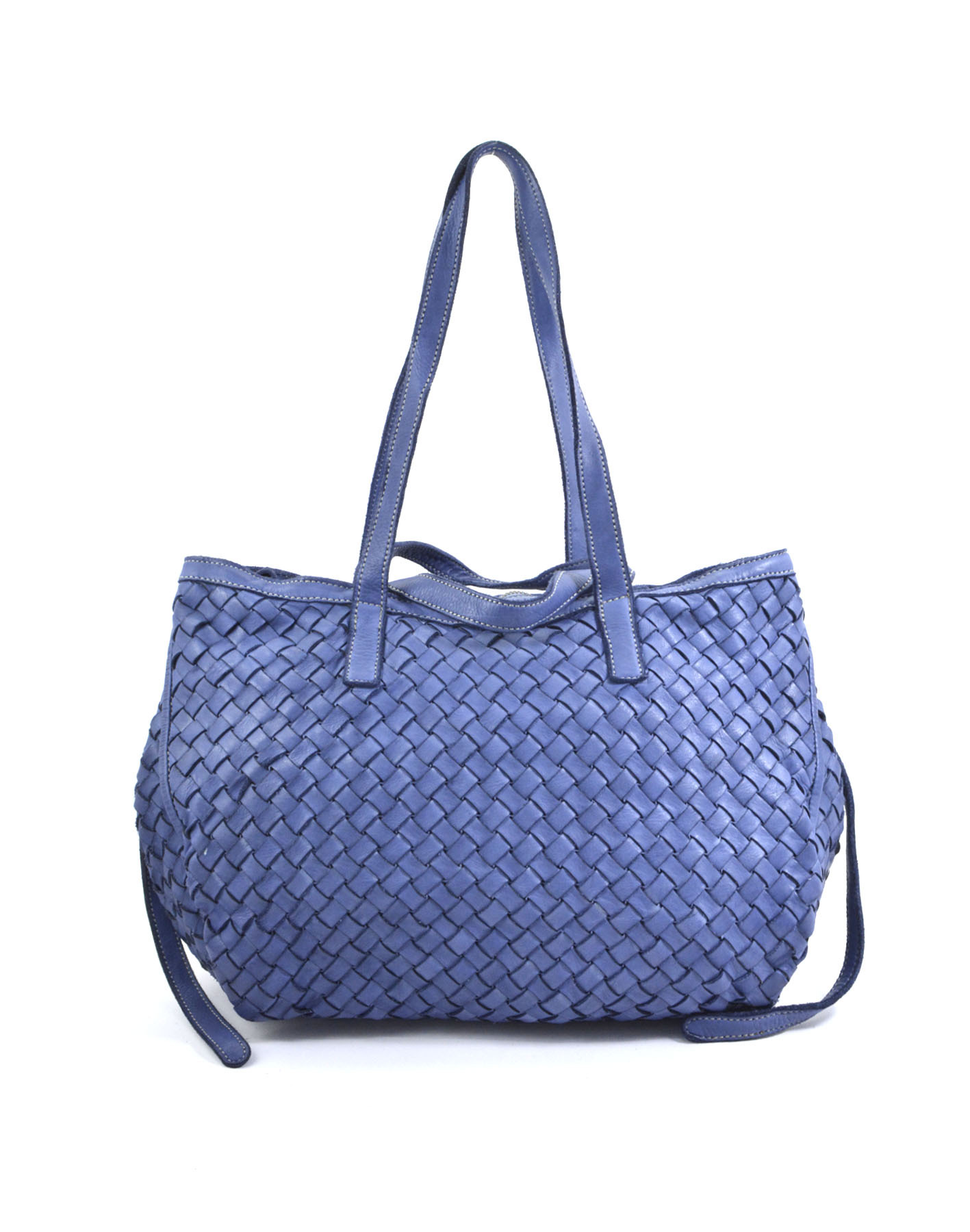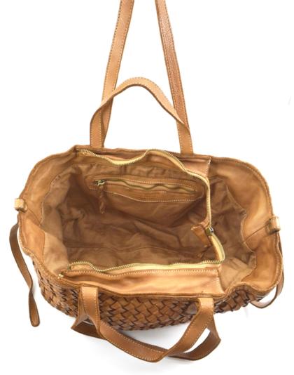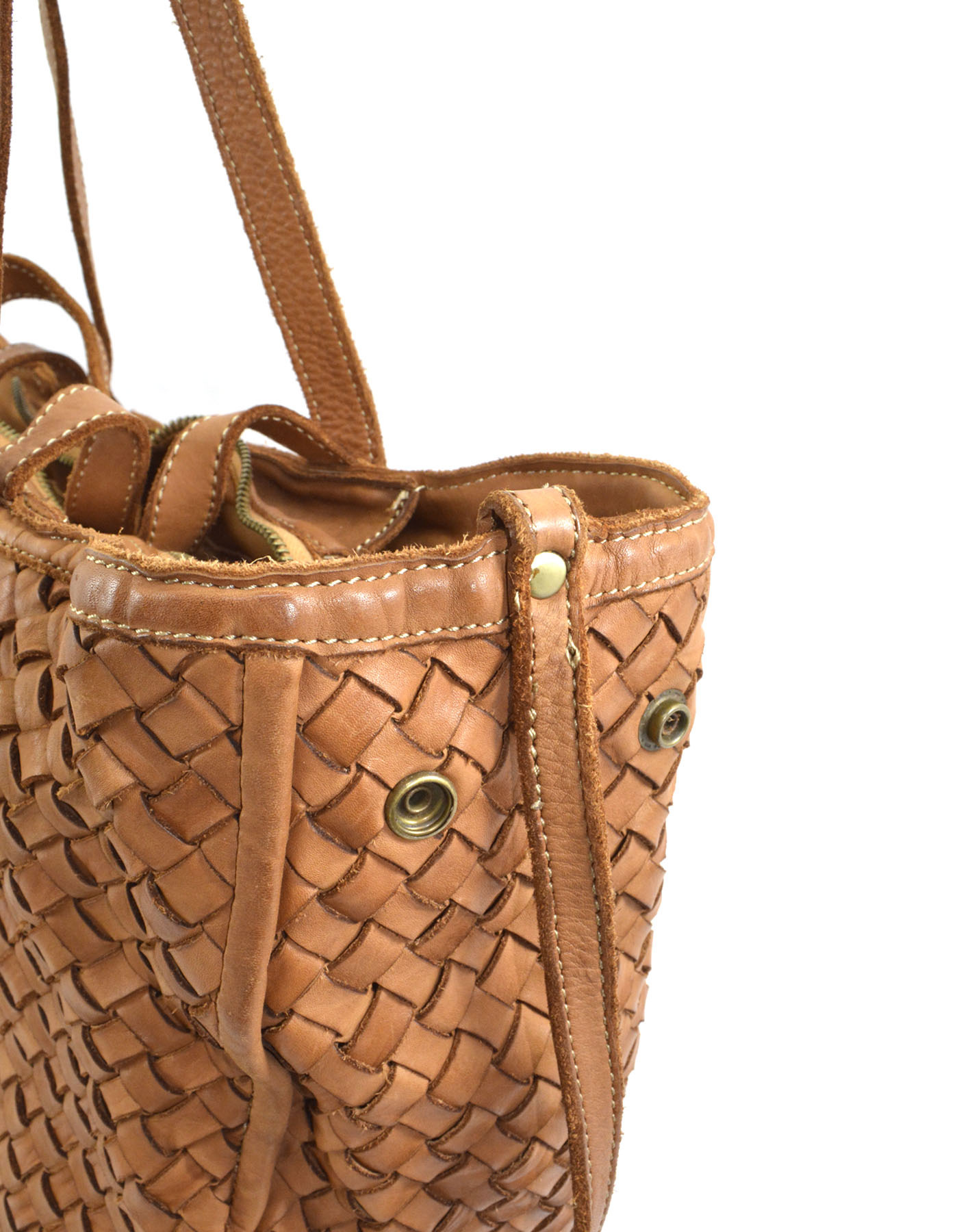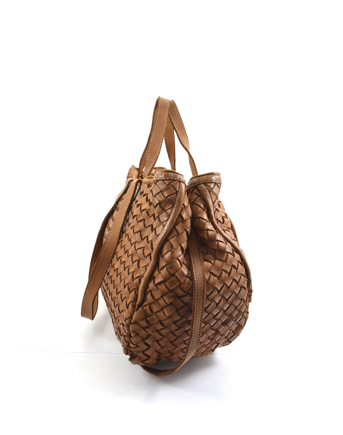 Garment-dyed woven calfskin bag with double handles for shoulder or hand carry. Side buttons adjust the opening size.